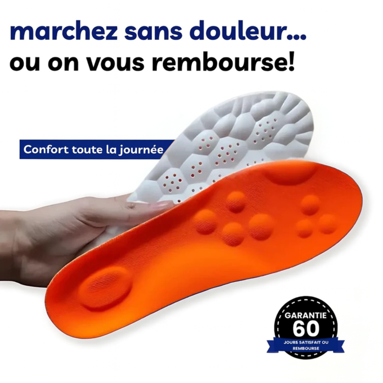 Nos semelles sont garanties 18 mois d'utilisation intensive. Contrairement aux semelles classiques qui s'aplatissent en quelques semaines, la 4D conserve ses propriétés amortissantes.